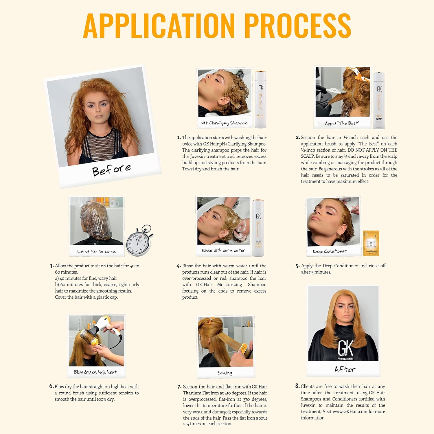 - NO WAITING TIME TO WASH AS NORMAL: There is no wait days after the application to be allowed to wash your hair again. This GK Hair Keratin treatment The Best kit also known as Brazilian keratin treatment comes with 100ml/3.4oz Ph+ Clarifying shampoo, GK Hair The Best Keratin Treatment, GK Hair Moisturizing Shampoo, GK Hair Moisturizing Conditioner and Deep Conditioner 20ml sachet Stop buying Frizz products that work for one day.