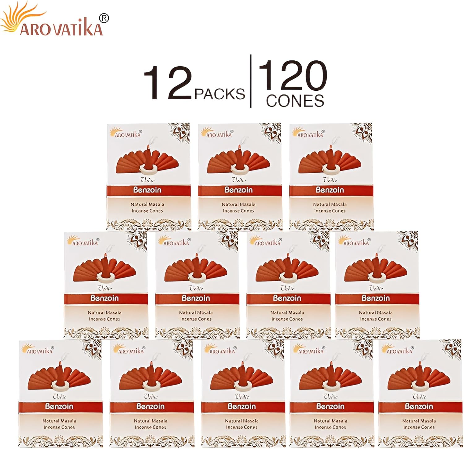 ARO VATIKA Vedic Benzoin Natural Masala 120 Incense Cones in Pack of 12 Boxes | Environment-Friendly Dhoop | Best for Prayer, Reiki, Meditation & Relaxation | Burn time- 25 mins