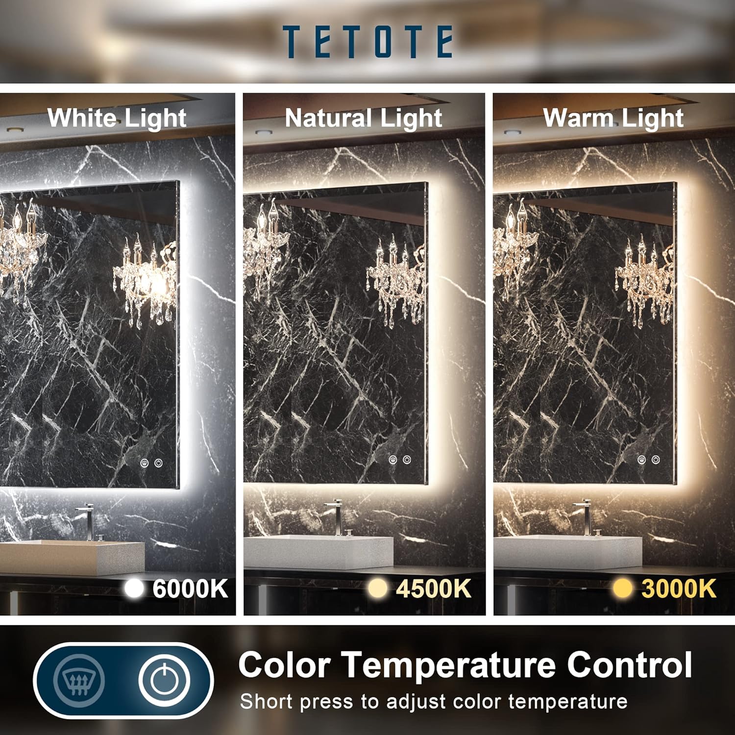 TETOTE 36 x 28 LED Backlit Bathroom Vanity Mirror with Light,3Color White/Warm/Natural,Anti-Fog Lighted Mirror,Dimmable,Wall Mounted