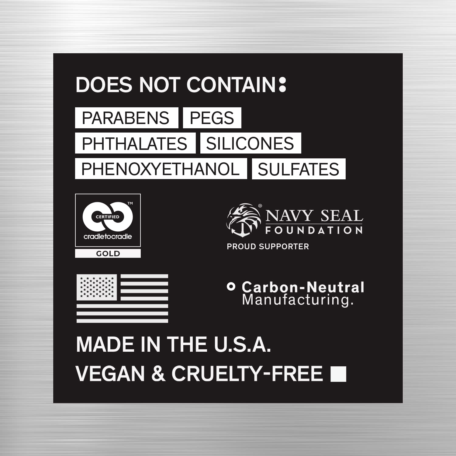 - Cradle to Cradle Bronze Certified: Does not contain parabens, phthalates, phenoxyethanol, silicones, sulfates, or PEGS. Vegan & Cruelty-Free. 99% biodegradable & carbon neutral manufacturing. Proud supporter of the Navy Seal Foundation. Made in the USA.
