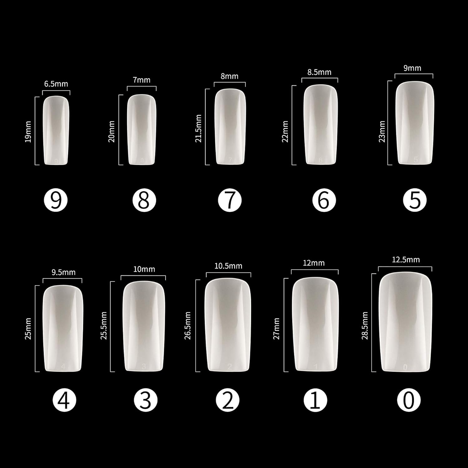 - Full-covered false nail tips, 1000pcs nail tips, 10 different sizes, stored in numbered case with 10 small grid.