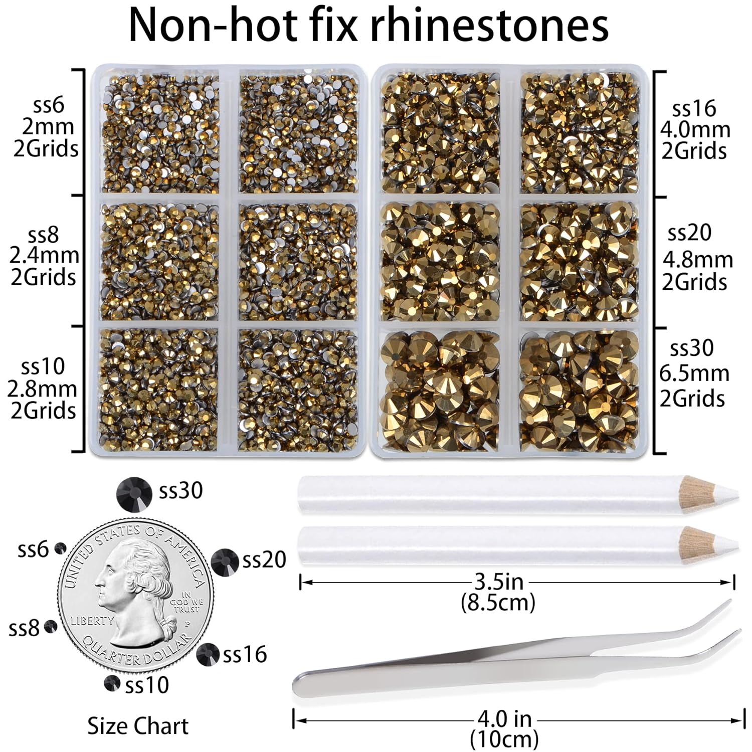 - Approx 6000 pcs of good quality sparkly flatback glass rhinestones with tweezers and 2 picker wax pencils help you easily pick up and set rhinestones in all your jewelry.