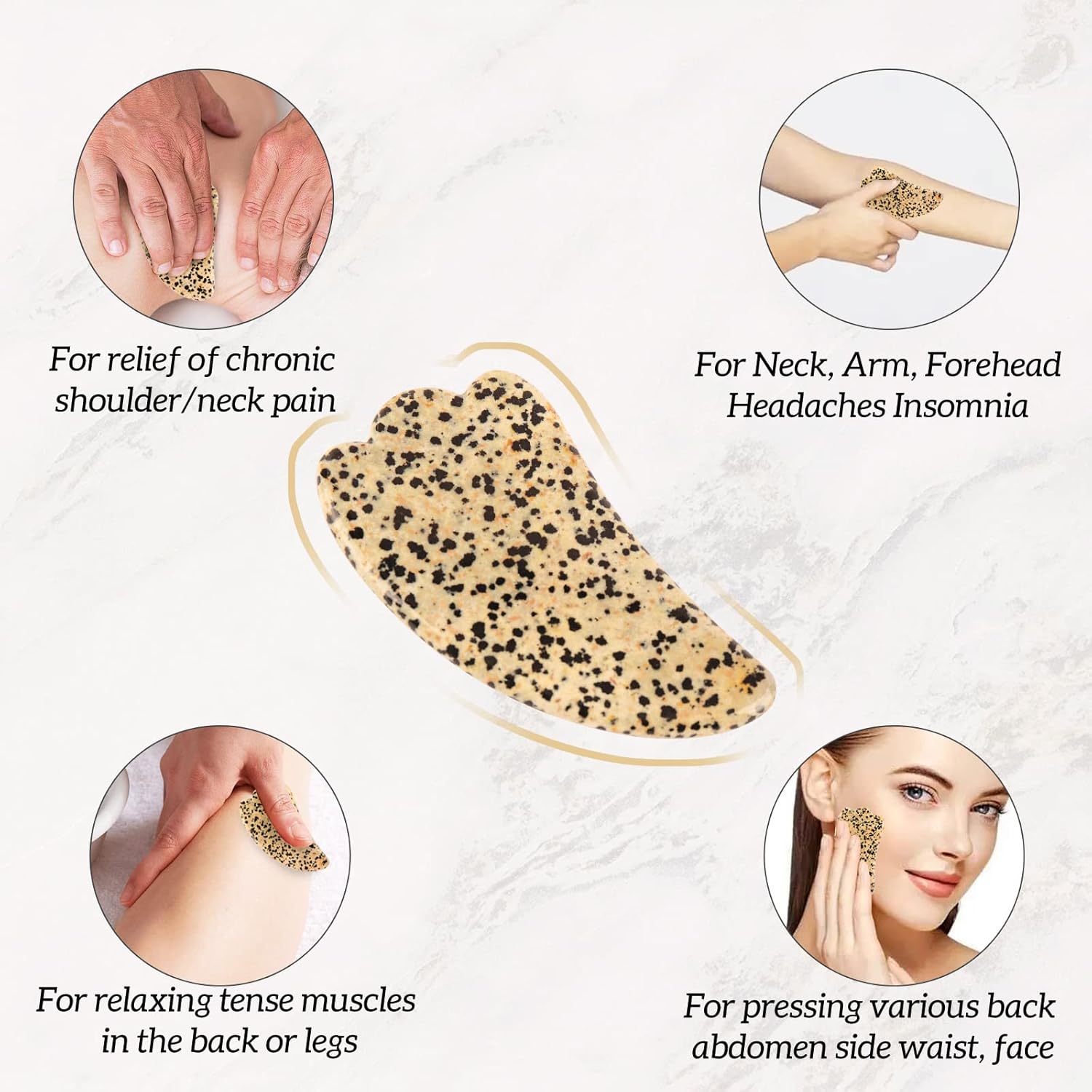 - 【MULTIPLE SHAPES FOR THE BEST EXPERIENCE】This Gua Sha tool set comes in 3 different shapes to use in different parts of your body for the best experience and let you feel as comfortable as being in a spa. The Gua Sha scraping massage tool itself is easy to store and travel with, you can definitely enjoy Gua Sha massage at any time and anywhere.