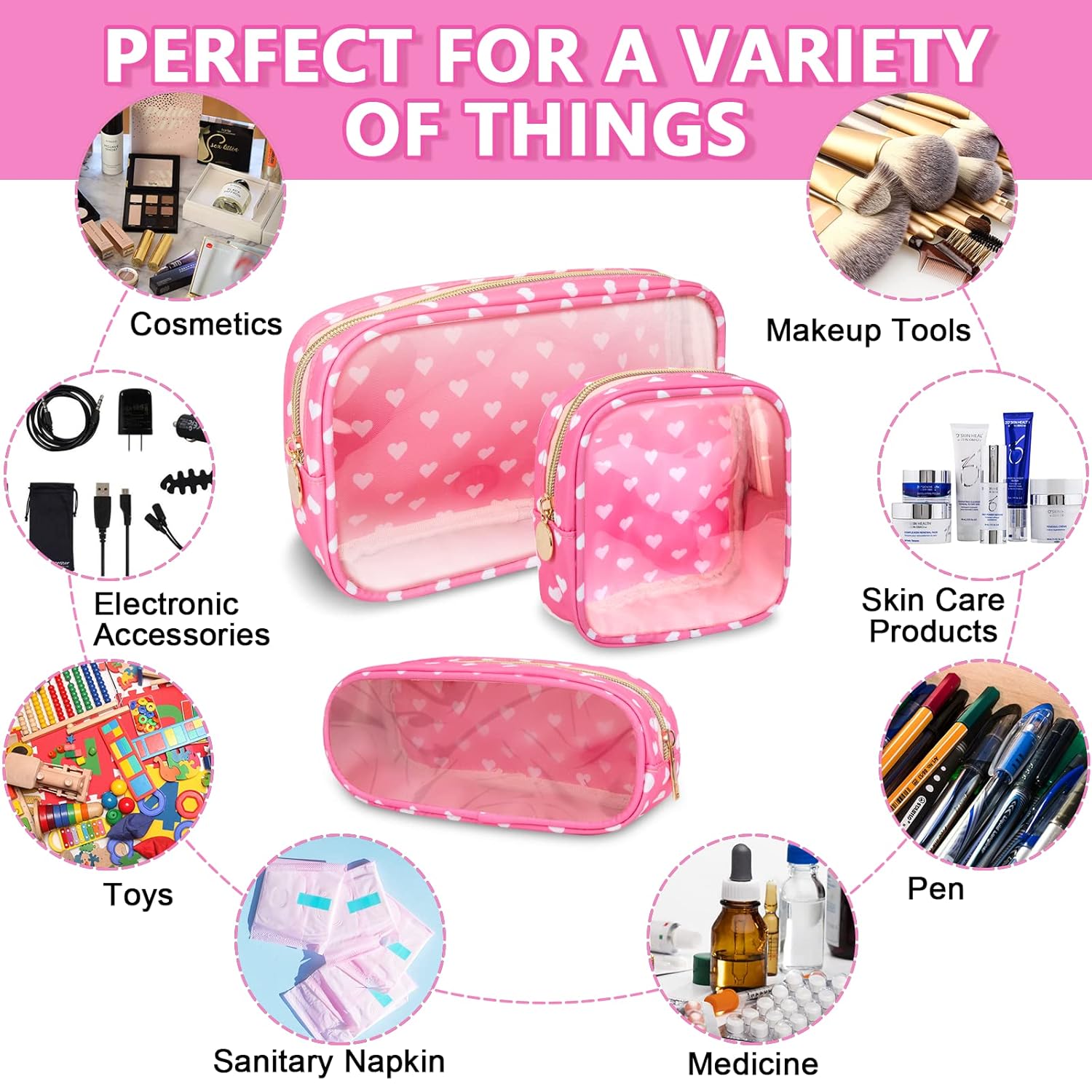 - 【Multi-purpose】The preppy makeup bag makes it easy to pack and carry cosmetics, jewelry, sanitary napkins, brushes, pencils, small electronic accessories, toiletries, medications, tools or other travel essentials. The transparent design allows you to see what's in your bag and quickly find the items you need.