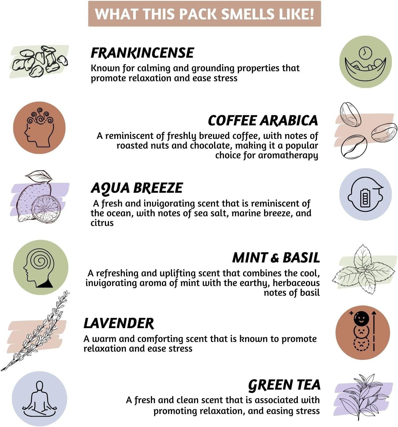 - [ VALUE PACK - Set of 6 ] : Our scented insense cones for meditation come in a value pack of widely used aromatherapy ingredients that include Frankincense, Coffee Arabica, Aqua Breeze, Mint & Basil, Lavender, Green Tea essential oils making it a complete fragrance experience.
