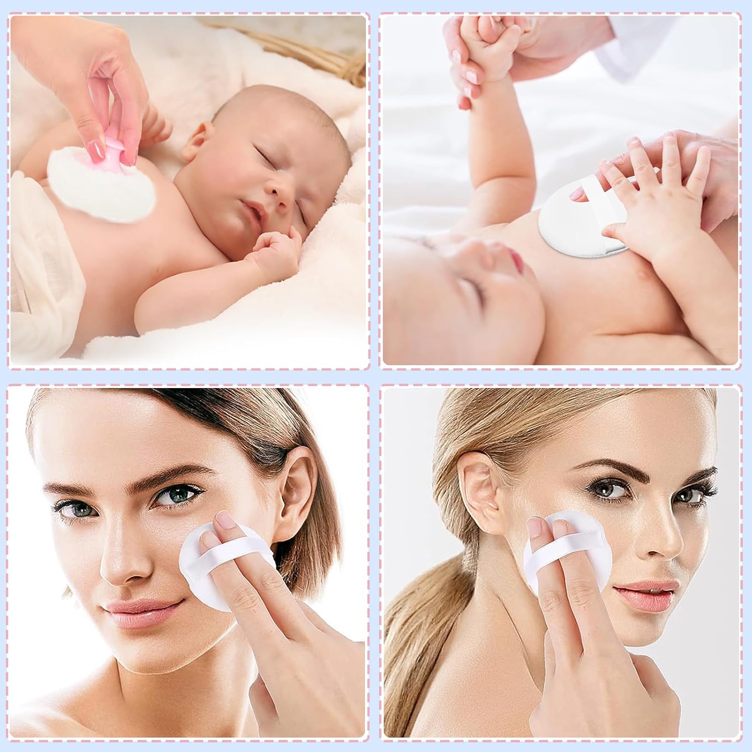 - ă2 Body Powder Puffsă: Considering the daily needs of our customers, our body powder container is equipped with 2 body powder puffs which made of delicate and smooth touch artificial woolïŒodorless, individually packaged. The large powder puff with a handle can directly take an appropriate powder apply for body, fast and convenient! The small puff (2.28 ") can take a small amount of powder more delicate and apply evenly on baby skin.