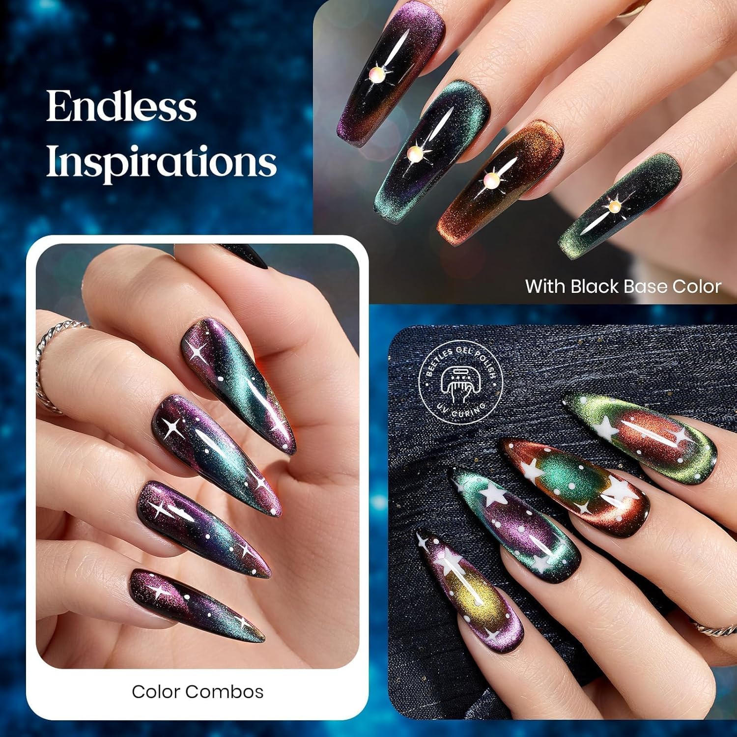 - ăMagic Color-Shifting EffectăExperience beetles chameleon cat eye nails that shift colors under different lighting! From soft sheer color to dazzling galaxy glitter effect, your nails will captivate every glance with dynamic, light Catching sparkle and sleek lines. Fashionable and eye Catching, highlighting your personality!