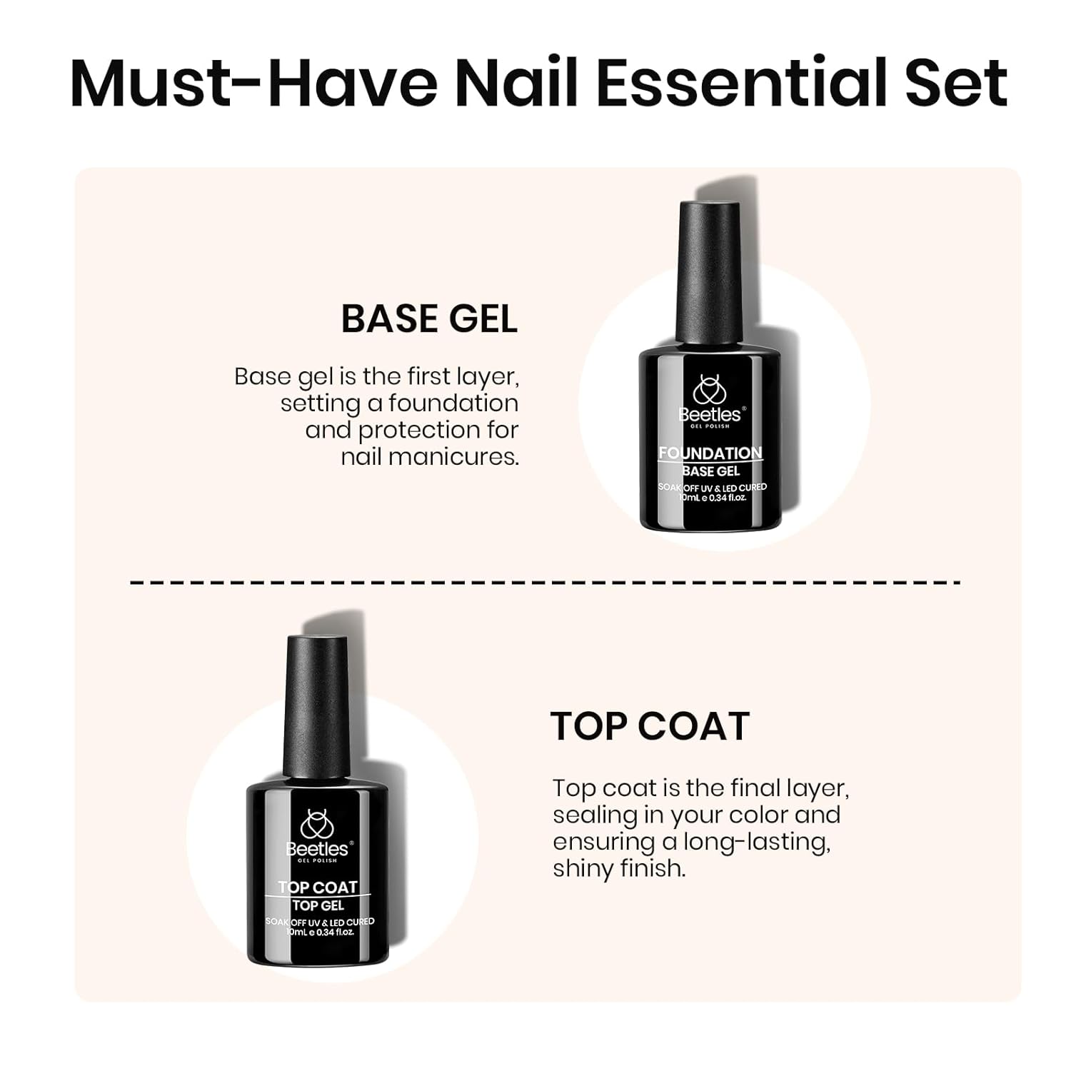 - Beetles No Wipe Top Coat and Base Coat: Enjoy long-lasting wear for over 28 days with a perfect shine. The flexible top coat prevents nicks, chips, and smudges. Tip: The base coat is designed to remain sticky, providing a solid foundation for the next coat of polish. (Note: The base gel should not be used as glue.) Tips: Avoid touching your nails after curing the top coat for 2 minutes to enhance the shine.