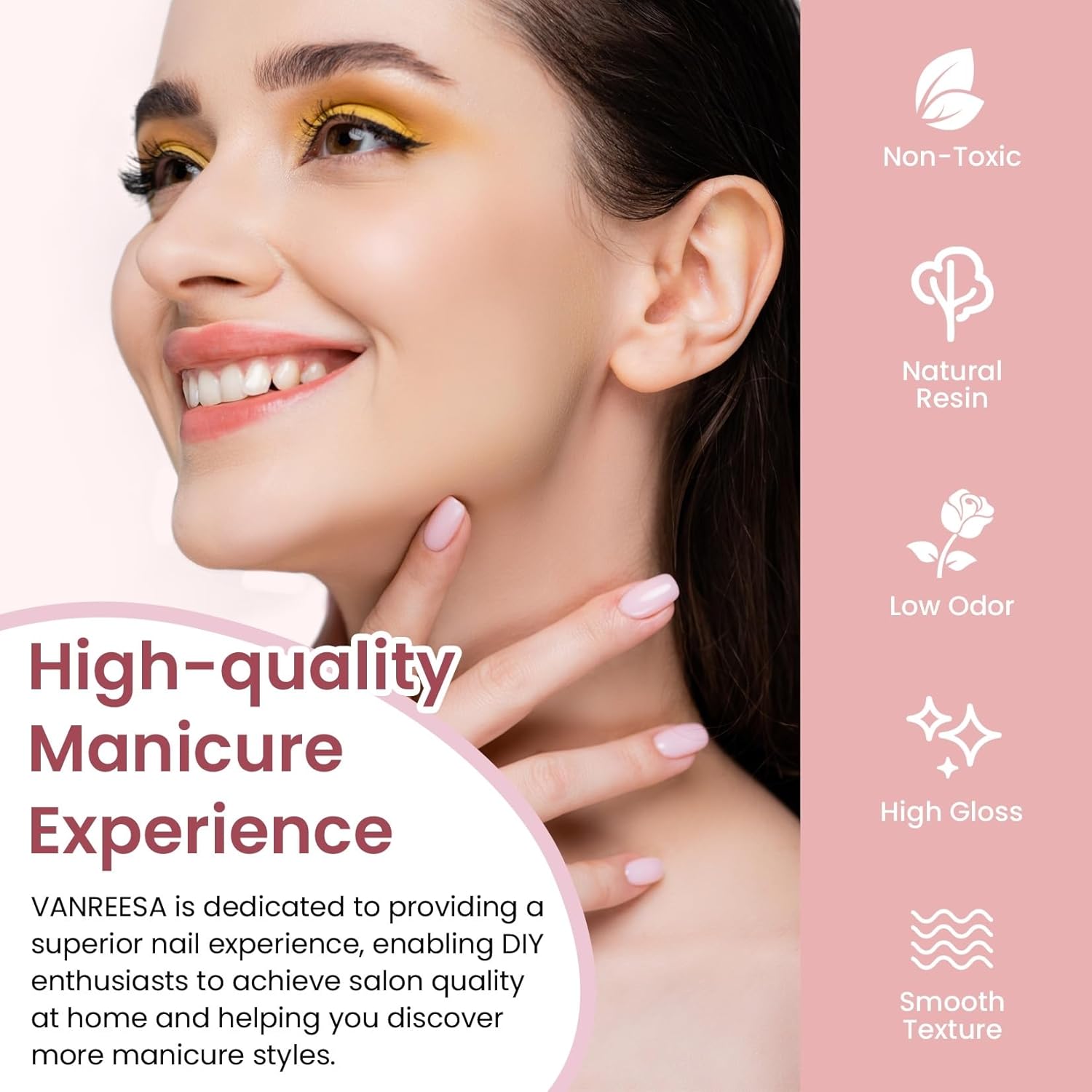 - ăHealthy & Long Lastingă VANREESA gel nail polish ingredients are made from natural resins that are safe, non-toxic and low-odor, so you can use them with confidence. VANREESA gel nail polish is silky smooth, brightly colored and easy to apply, so even beginners can master its use. Prepare well before you start (shaping, buffing, cleaning) and follow the proper steps in the manicure instructions and your nail art will last for 21+ days!