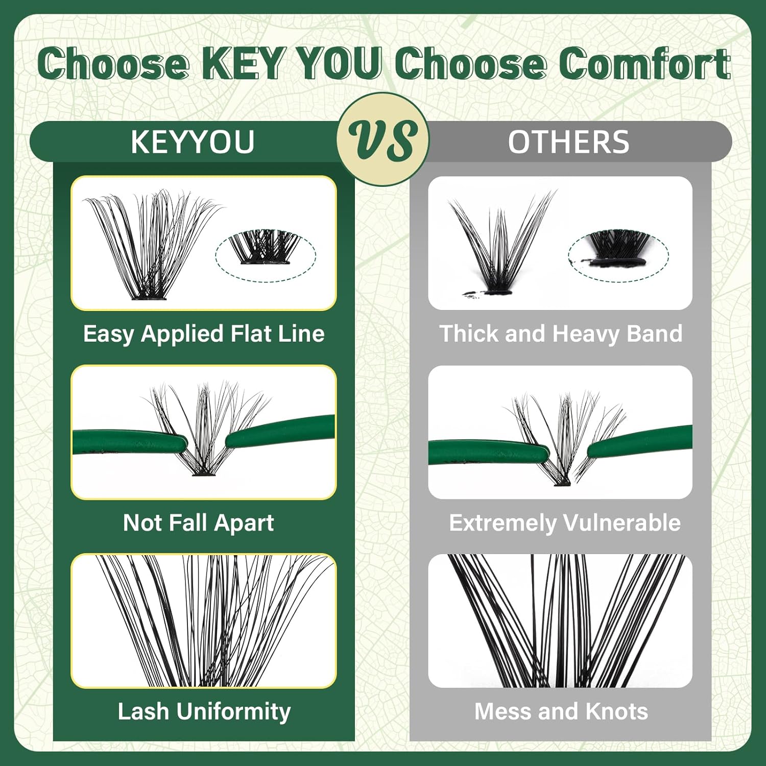 - 【Super Soft&Comfortable】KEYYOU new lash clusters made with softer updated materials, it is lighter and more comfortable to wear, and can be worn all day without burden, making the beauty last longer.The lashes clusters with super thin roots allow you to better fit your natural eyelashes.