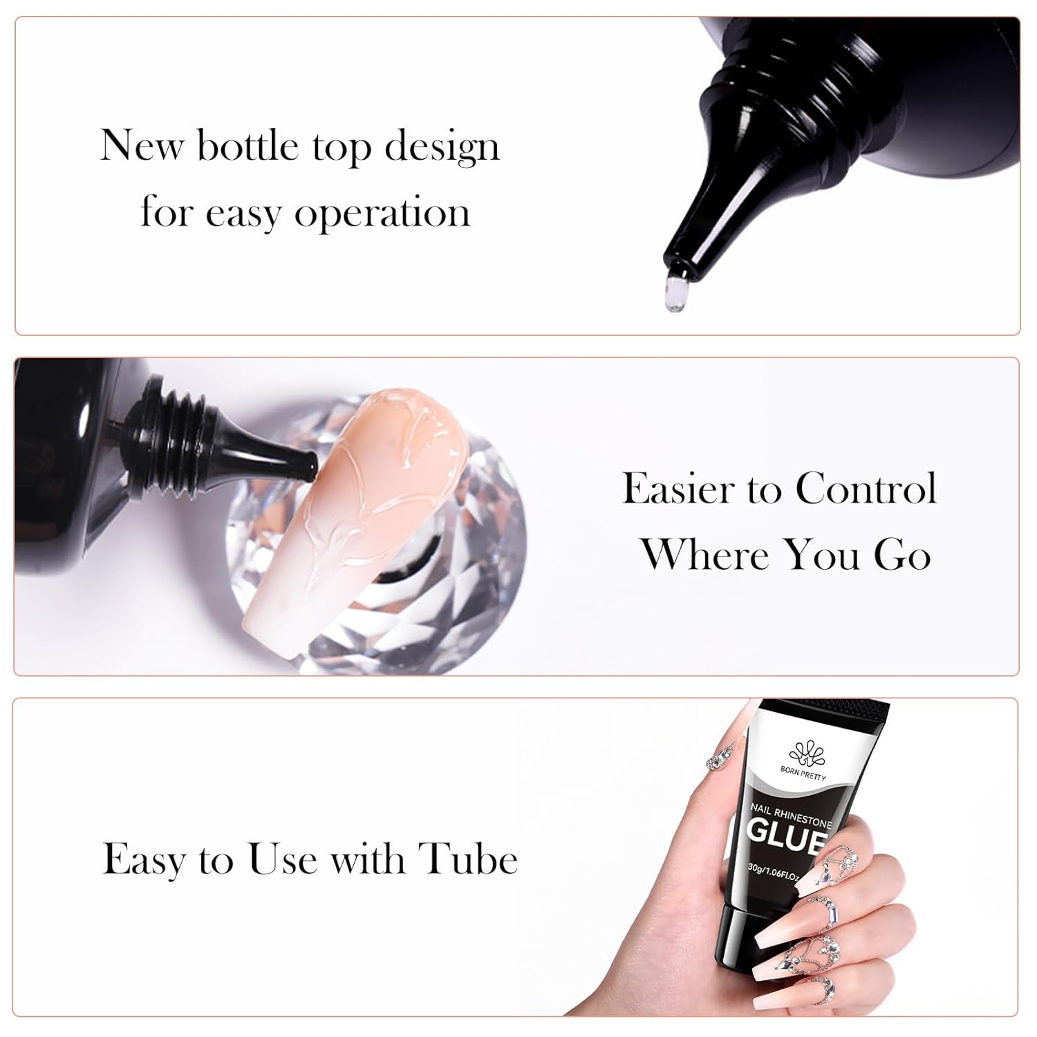 - CONVENVIENT FOR USE -This nail stones nail glue gel is convenient for use with tube design, easily to squeeze out as much as you need for nail art bling design, no mess! No spilling at all! Super Adhesive. This large size 30ml rhinestones glue is nail tech must haves. A great add-ons for nail tech supplies.