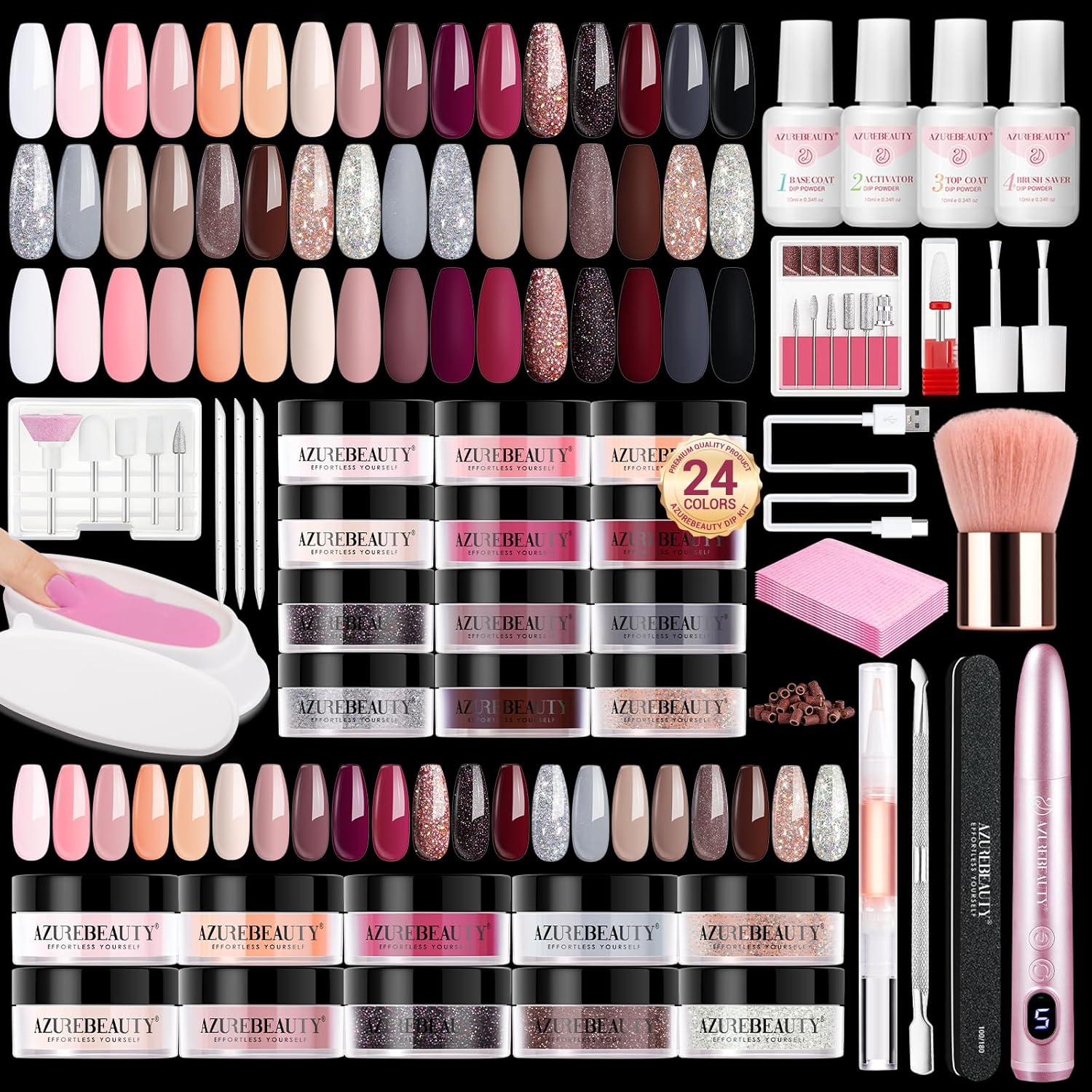 - ă92Pcs Complete Manicure Kită AZUREBEAUTY dip nails powder starter kit includes 24*0.16 oz gorgeous colors of nail dip powder, 4*0.33 oz dip powder liquid set(base coat/activator/topcoat/brush saver), 1*Portable Electric Nail Drill, 11* drill bits, 10 *table mat, 1*Ceramic Corn Head, 1*type-c charging cable, 30*sanding band, 1*cuticle oil pen, 3*nail sticks, 1*nail file, 1*dust brush, 1*recycling tray, 2*liquid replacement brush, 1*storage bag; and user manual quick start guide