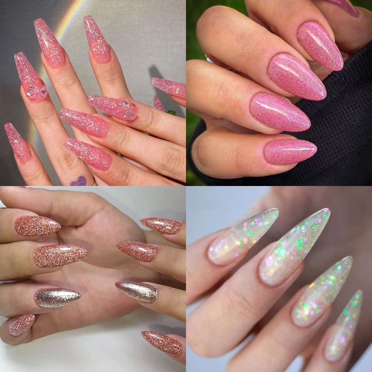 - 【Poly Nail Gel with Glitter 】 The poly nail gel is designed with holographic glitter or iridescent chunky glitter,you can see beautiful shimmer effect on it. It’s suitable for glitter ombre nail design,bling nail art decoration and so on.