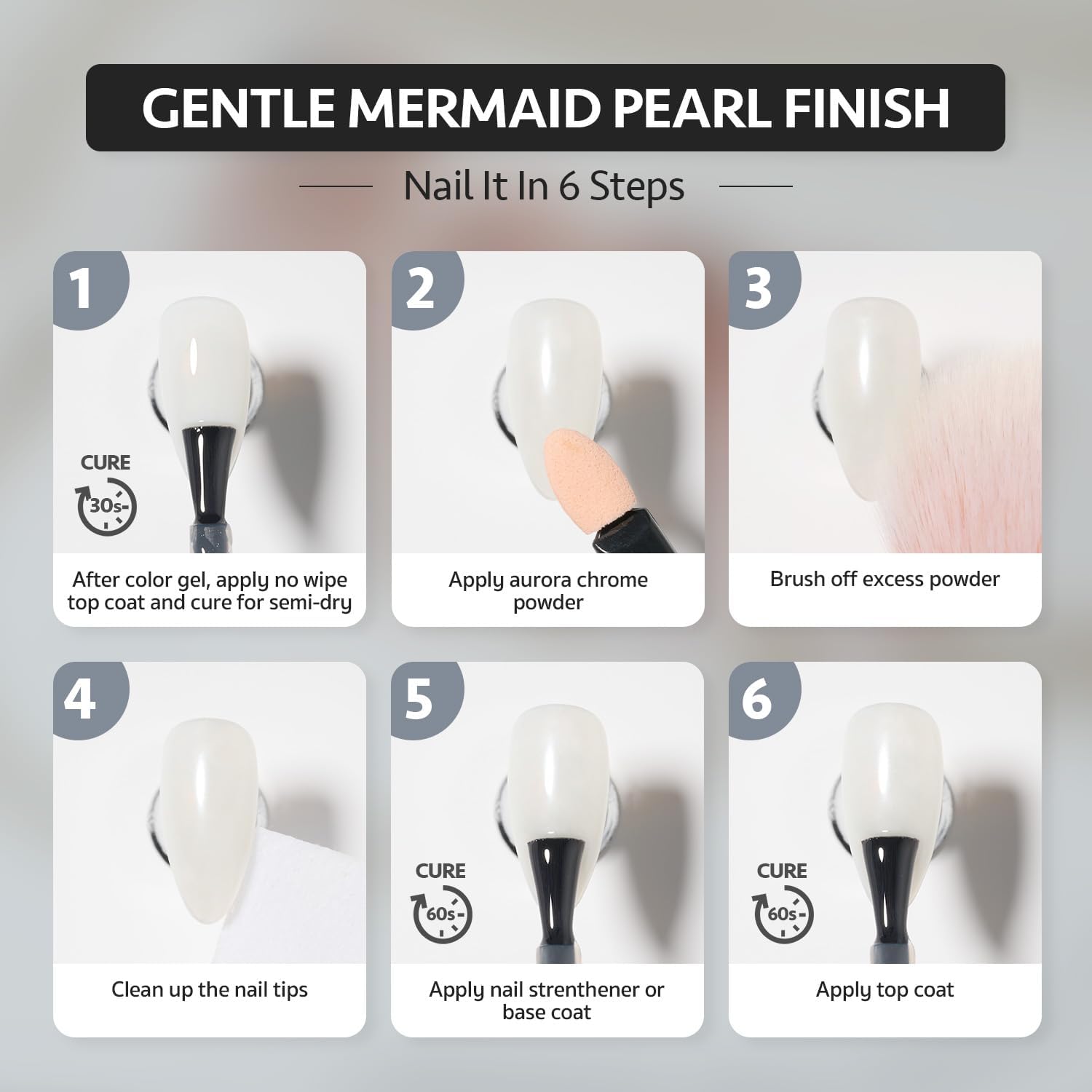 - Aurora Effect: Achieve a stunning mirror-like finish on your nails by using our magic chrome powder with a semi-dry, no wipe top coat.