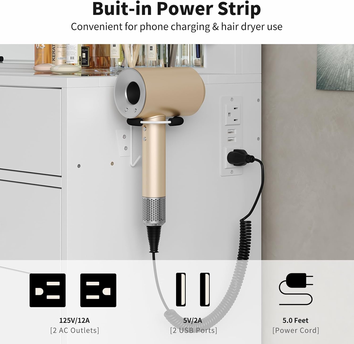 - Convenient Power Station:Stay charged and connected with the built-in power outlet, featuring a dedicated hairdryer rack along with 2 standard plug sockets and 2 USB ports. This makeup vanity allows you to power up your devices or styling tools while you effortlessly create your perfect look