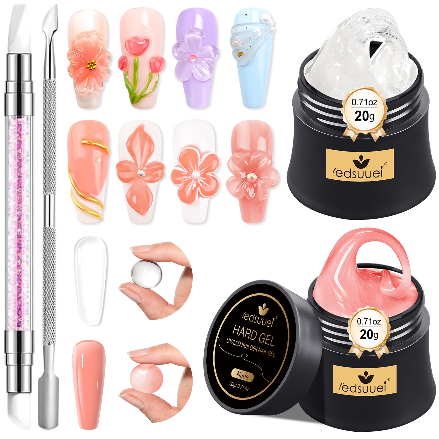 - Beginners Solid Builder Gel: This hard sculpting gel for nails set includes 20g*2 color gel (clear and nude), 1*silicone smear pen and 1*steel pusher, perfect for beginners and nail art lovers, this 3d builder gel set allows you to easily create amazing 3D manicure designs at home.