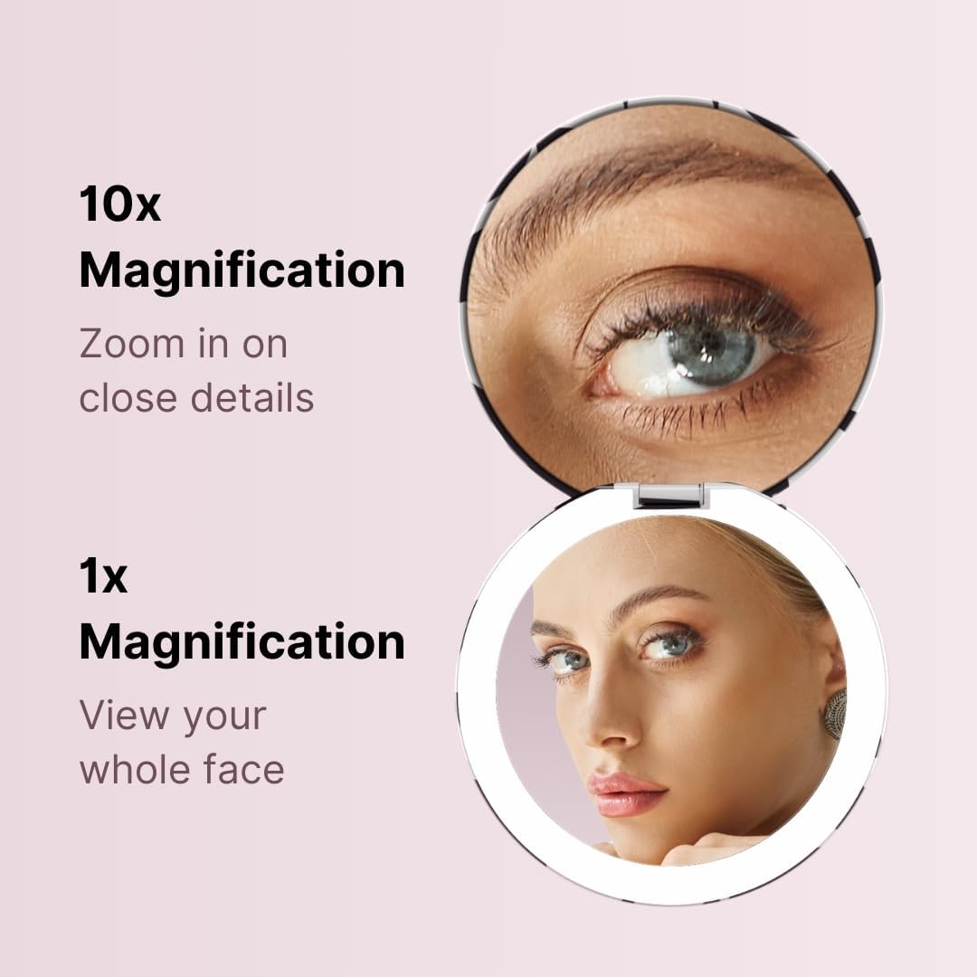 - Double-sided magnification (1x and 10x) so you can apply a full face of makeup, do a quick touch-up on the go, or focus on a detailed task like tweezing or inserting contact lenses