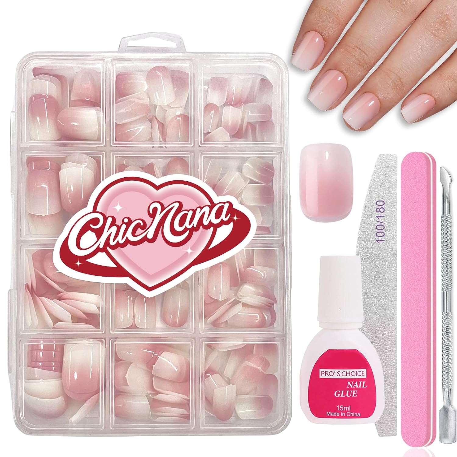 - 【Perfect Salon Stick On Nail Set】This ChicNana Ombre Fake Nails Kit includes 240pcs ombre square press on nails glossy, all necessary tools as files*2, stainless steels cuticle pusher*1, 15ml nail glue*1 and the box with press on nails. Ombre false nail is a basic style in nail art and is a must have set for every girl who loves nail art