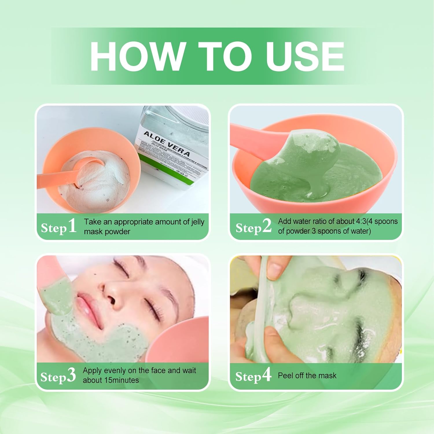 - 【EXPERIENCE PROFESSIONAL SPA AT HOME】 Mix the jelly mask powder and water in the bowl in a 4:3 ratio until combined. If you feel that it is too thin and it will slide down your face, you can add more powder. If you feel that it is too dry to fully absorb, you can add some water. The gel mask for face is fast acting, does not drip, and need 20 minutes of regular use for lasting results. With this peel off hyaluronic acid powder, you can experience a comfortable and undisturbed professional spa experience at home. It is more cost-effective than beauty salons.