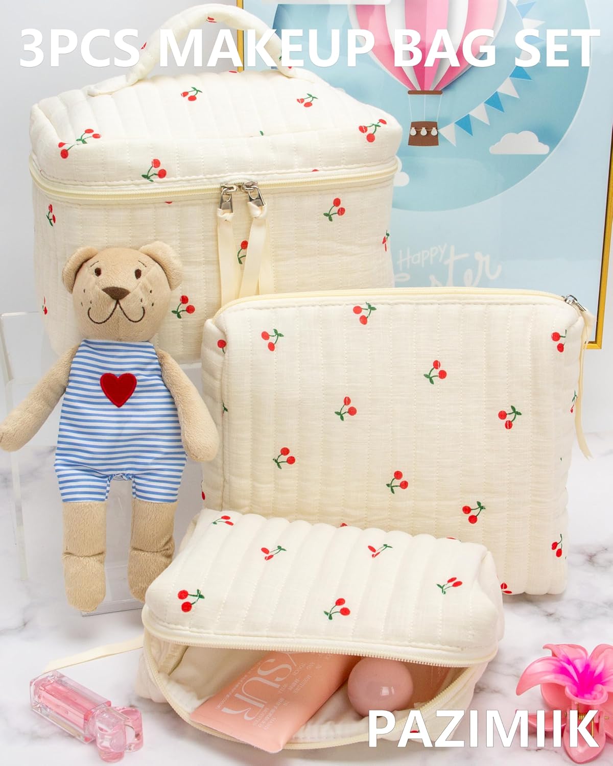 PAZIMIIK 3PCS Makeup Bag SET Large Travel Quilted Zipper Soft Cosmetic Case Pouch for Women Girls Make Up,Cherry Beige