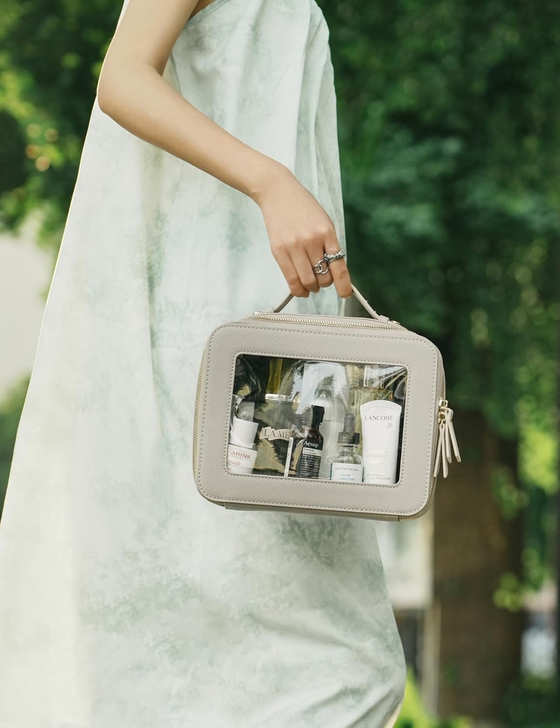 - [Premium Material and Durability] – The clear cosmetic case, both the exterior and interior, is crafted from high-grade saffiano faux leather, which is highly scratch resistant, durable and exceptionally easy to keep clean. It features a smooth zipper for secure closure, and elegant light gold metal hardware accents, adding a luxurious and sophisticated touch to the bag's overall design.