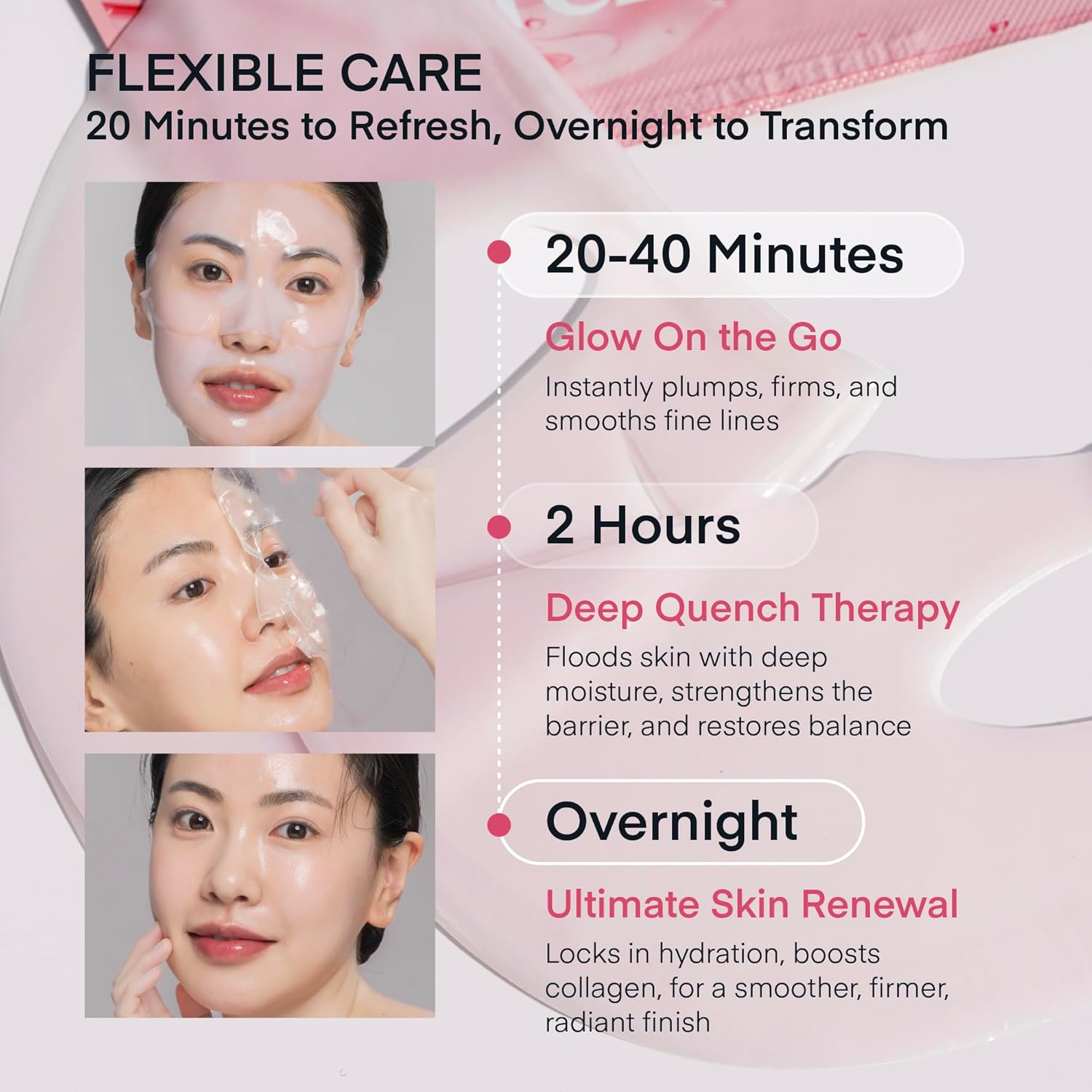 - Compare to Other Brands - No glue/tape, no fragrance, no peppermint. Apply for 20 - 30 minutes for instant hydration and a luminous glass-skin glow. Deeper hydrates and revitalizes in just 2 hours. Wear overnight to maximize results.