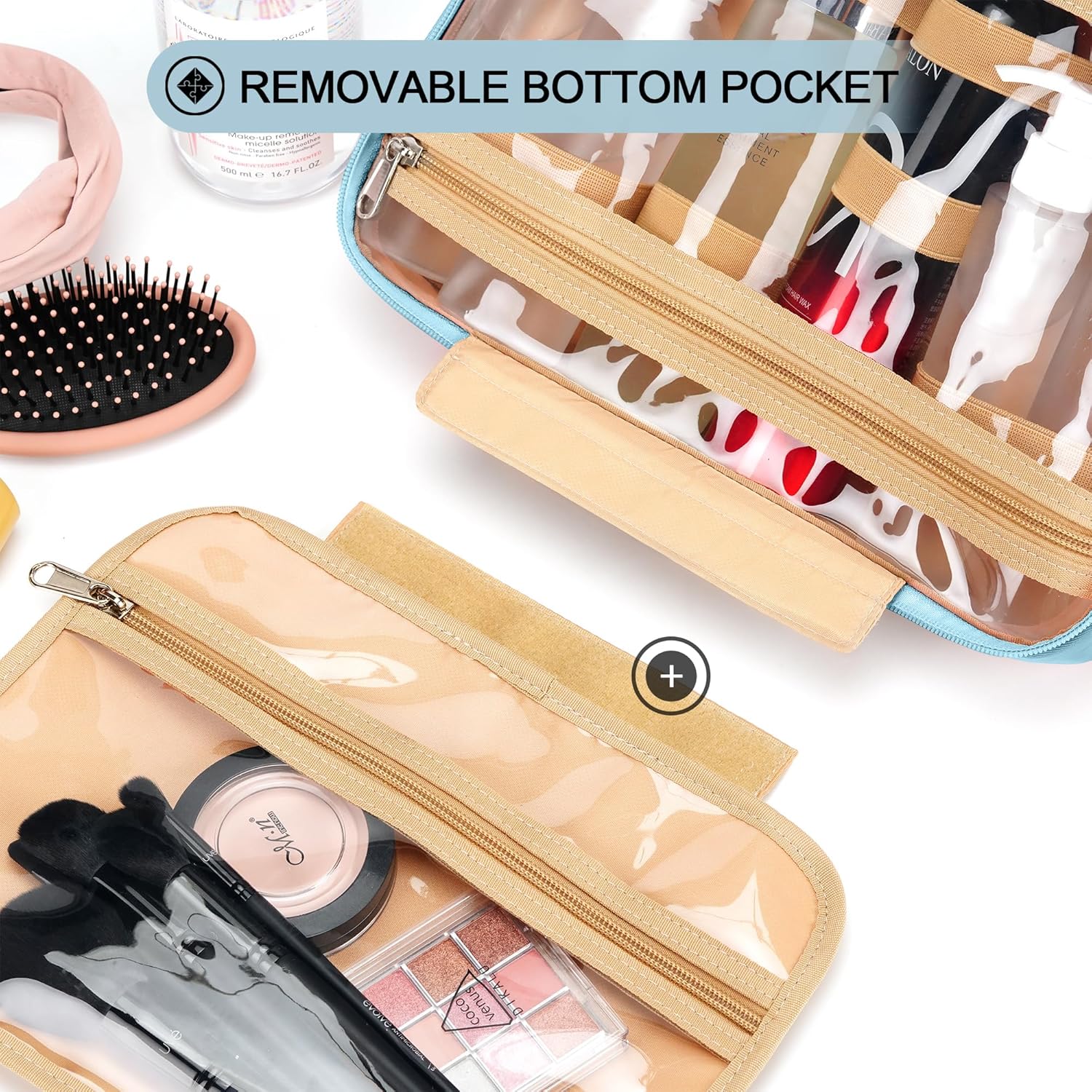 - CONSIDERABLE DESIGN - The elastic bands inside the two main compartments can keep the different height bottles fixed and upright. Your comb, toothbrush, razor, and leak-prone makeup can all go in there, even a hair dryer. 360ยฐ metal hook gives you a variety of hanging options.