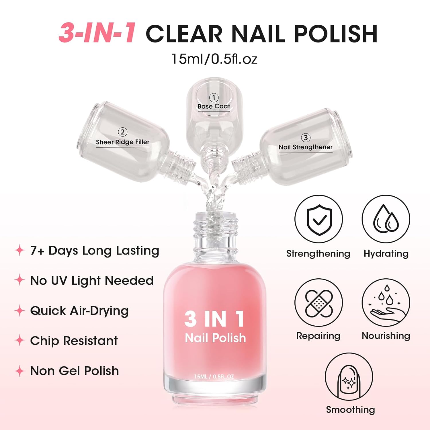 - Model Name : 3-In-1 Clear Nail Polish, Nail Ridge Filler, Nail Corrector Base Coat, Nail Strengthener and Growth Prevents Breakage, Tinted Pink Enhances Natural Look 3-In-1 Clear Nail Polish, Nail Ridge Filler, Nail Corrector Base Coat, Nail Strengthener and Growth Prevents Breakage, Tinted Pink Enhances Natural Look